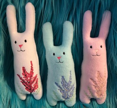 These cute little flowered bunnies come in 4 , 6, 7 , 10 and 12 inches. They are fast and easy and OH SO CUTE. Done in one hooping and great for beginners