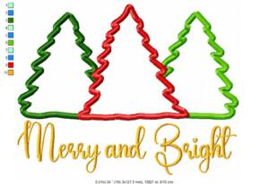This simple applique is perfect for beginners with a 5×7 hoop , it is turned so remember this. 3 easy appliques are the trees and the beautiful words Merry and bright . Great for Kitchen towels, pillows, shirts, totes.